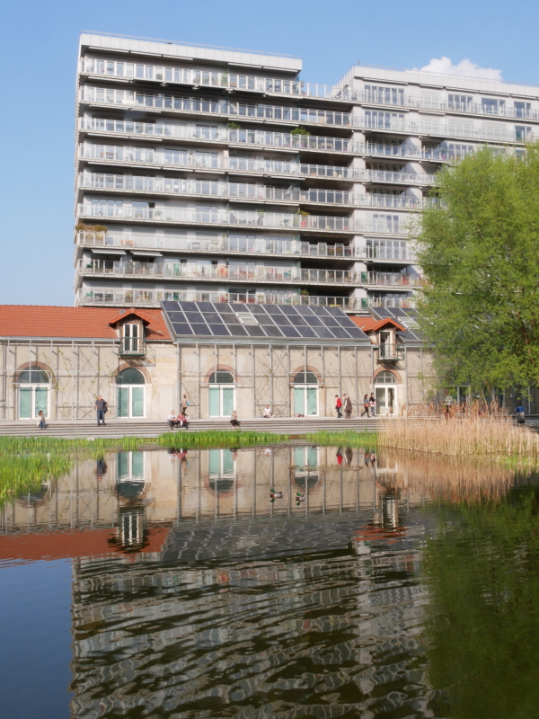 La photo de droite: vue plus large, avec les batiments qui se reflétent à la surface de l’eau.
